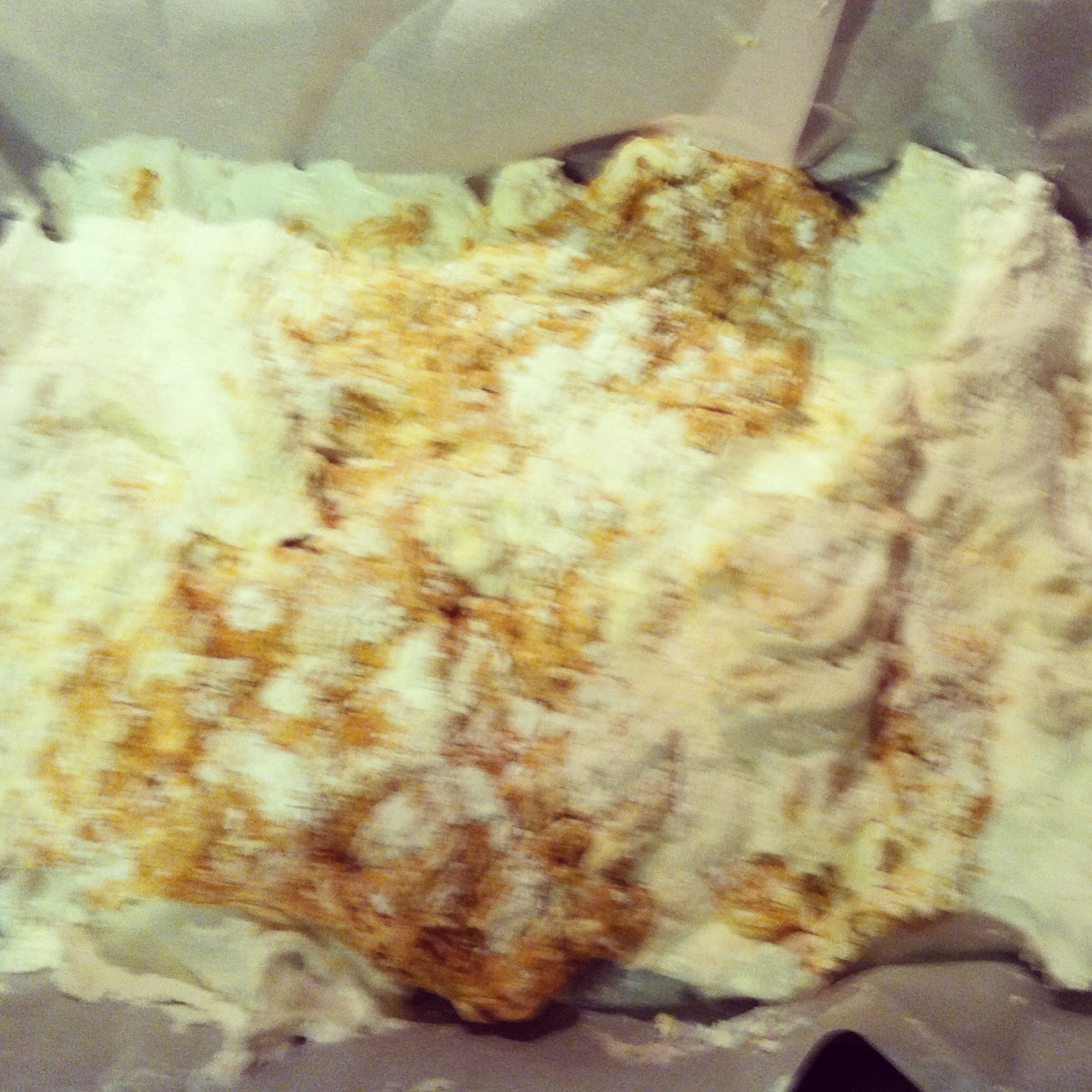 9: Spread the marshmallow fluff in your pre-prepared pan, and attempt to swirl the way-too-cooled-for-this peanut butter fluff in too. Smack the whole thing a few times with your spatula, then decide you don’t care if it’s ugly, because you’re going to make them beautiful by dipping them in chocolate.