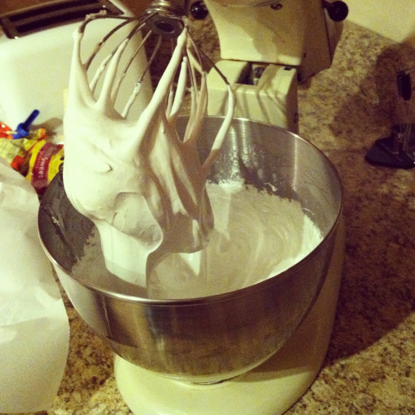6: When the candy thermometer says the boiling substance will melt all your skin off, but won’t form a hard ball in water, pull it off the heat. Then, pour it down the side of your mixer into the gelatin, with the mixer going on low or medium. Or, if you have my ancient mixer, make sure it’s going on any speed it’s willing to work on.
