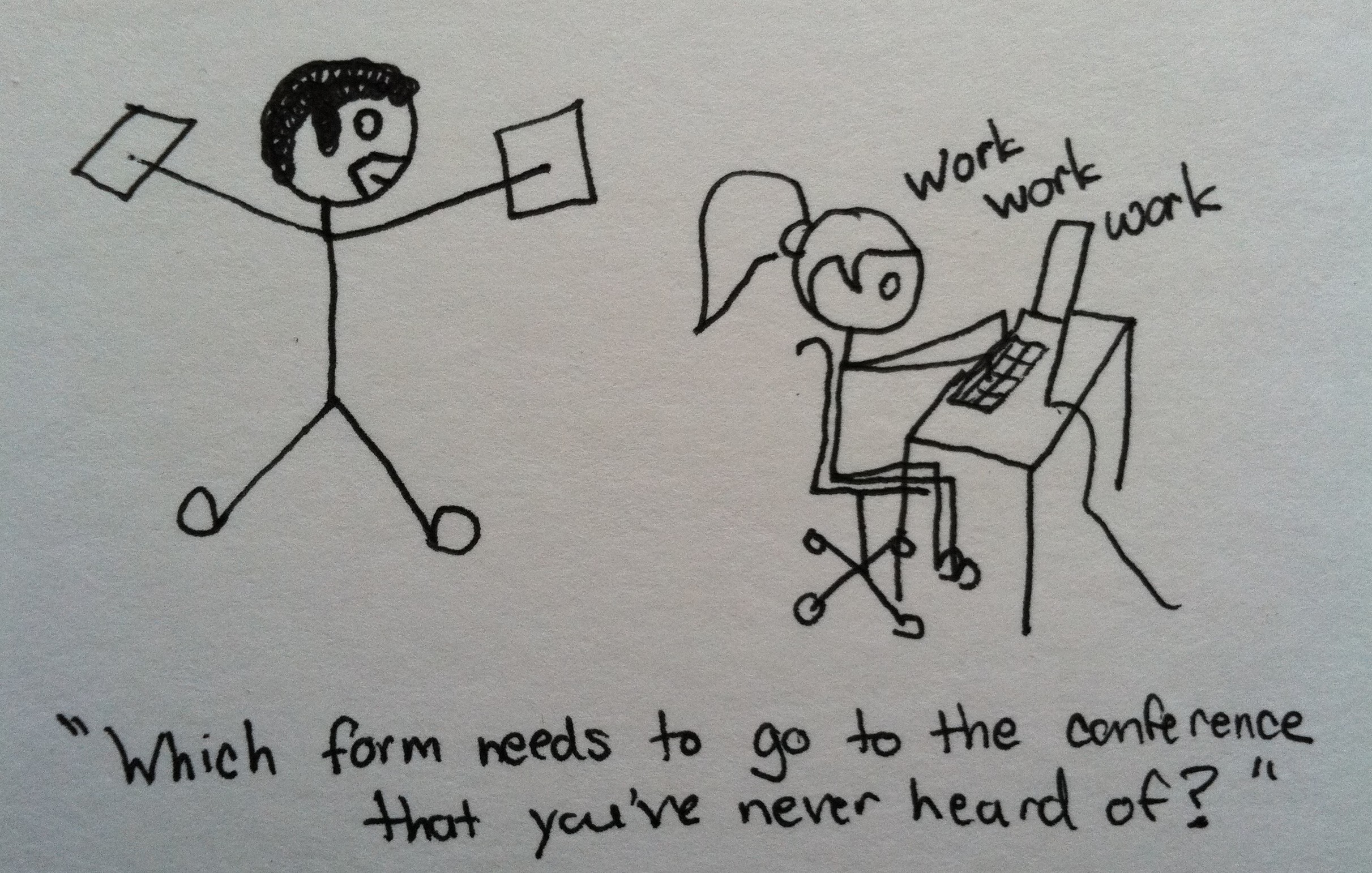 Me: “I thought you said this was important. Probably important enough that he won’t mind if you barge right in and ask him about a conference that has a whole team dedicated to it.”
