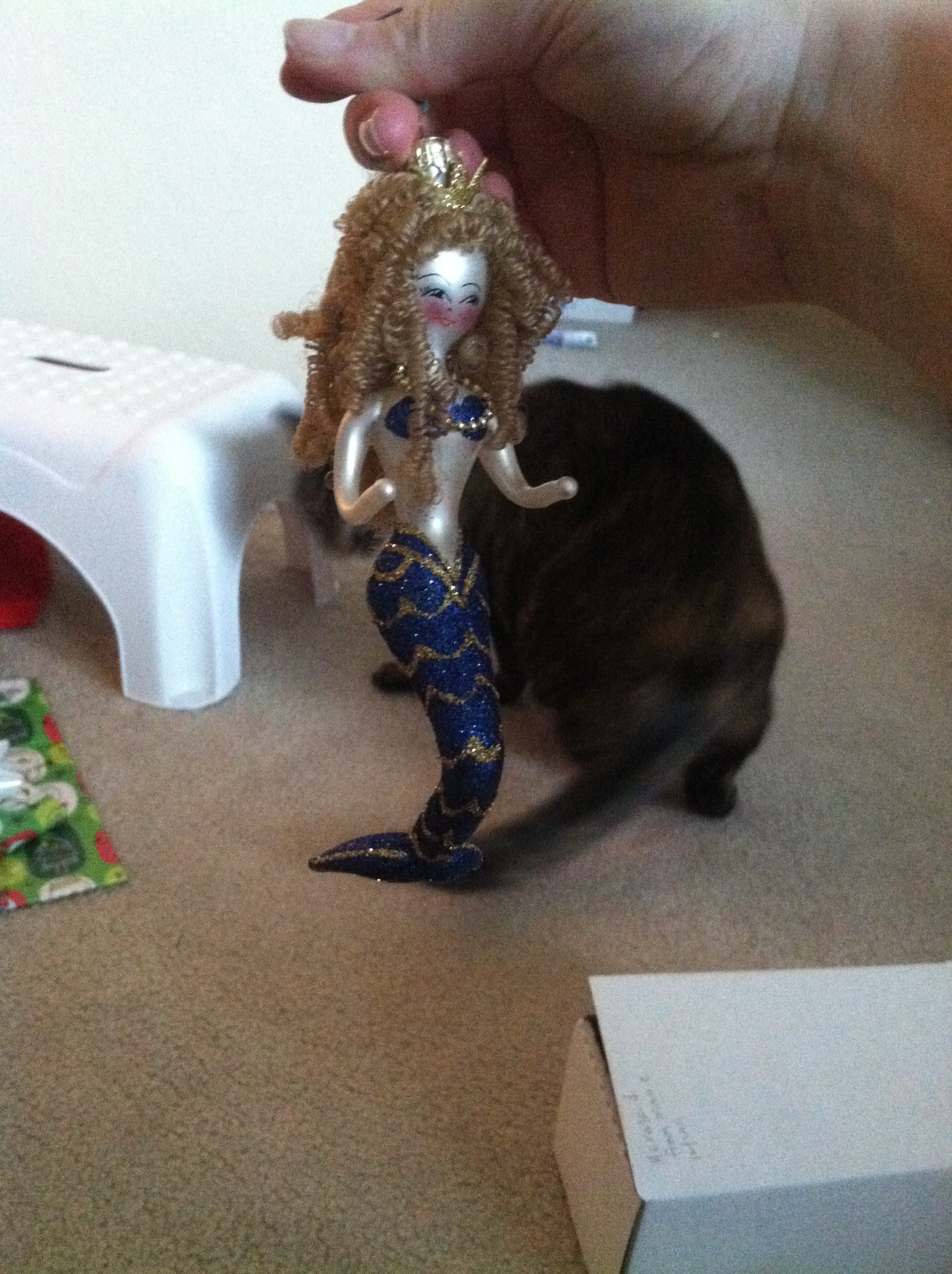 Meet the Christmas Mermaid, a staple for Christmas trees on shipwrecks. She’s festive AND practical. Also, she’s blue because water is cold in December. Duh. She now lives on the toasty warm tree, pining for her frozen watery home*******. She’s my festive hostage, courtesy of my mother informing me that this was obviously my decoration, despite my memories to the contrary. Thanks, Mom.