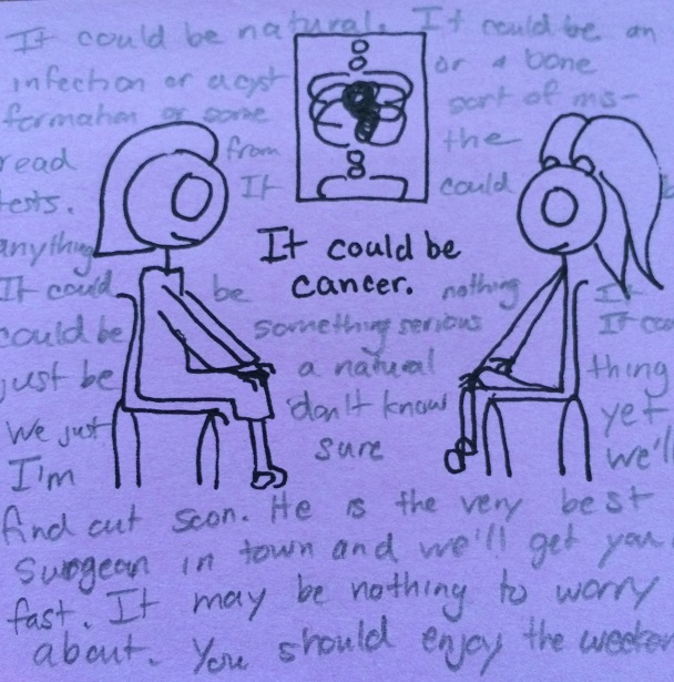 My doctor sat down with me in the exam room, something a doctor had never done before. She still had that same strange expression on her face – a frozen expression, the corners of her mouth slightly upturned in an almost-smile, with her eyes very, very focused on me – which I’m sure was meant to be comforting, but was really just jarring. She touched my hand while she spoke to me, something else a doctor had never done.