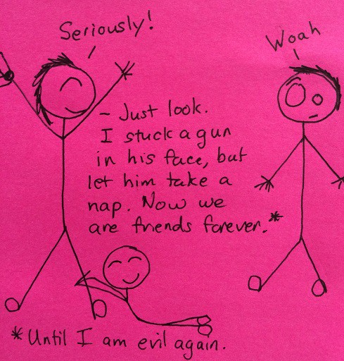Because yelling at someone with a gun is totally safe….if you’re a stick figure that I draw.