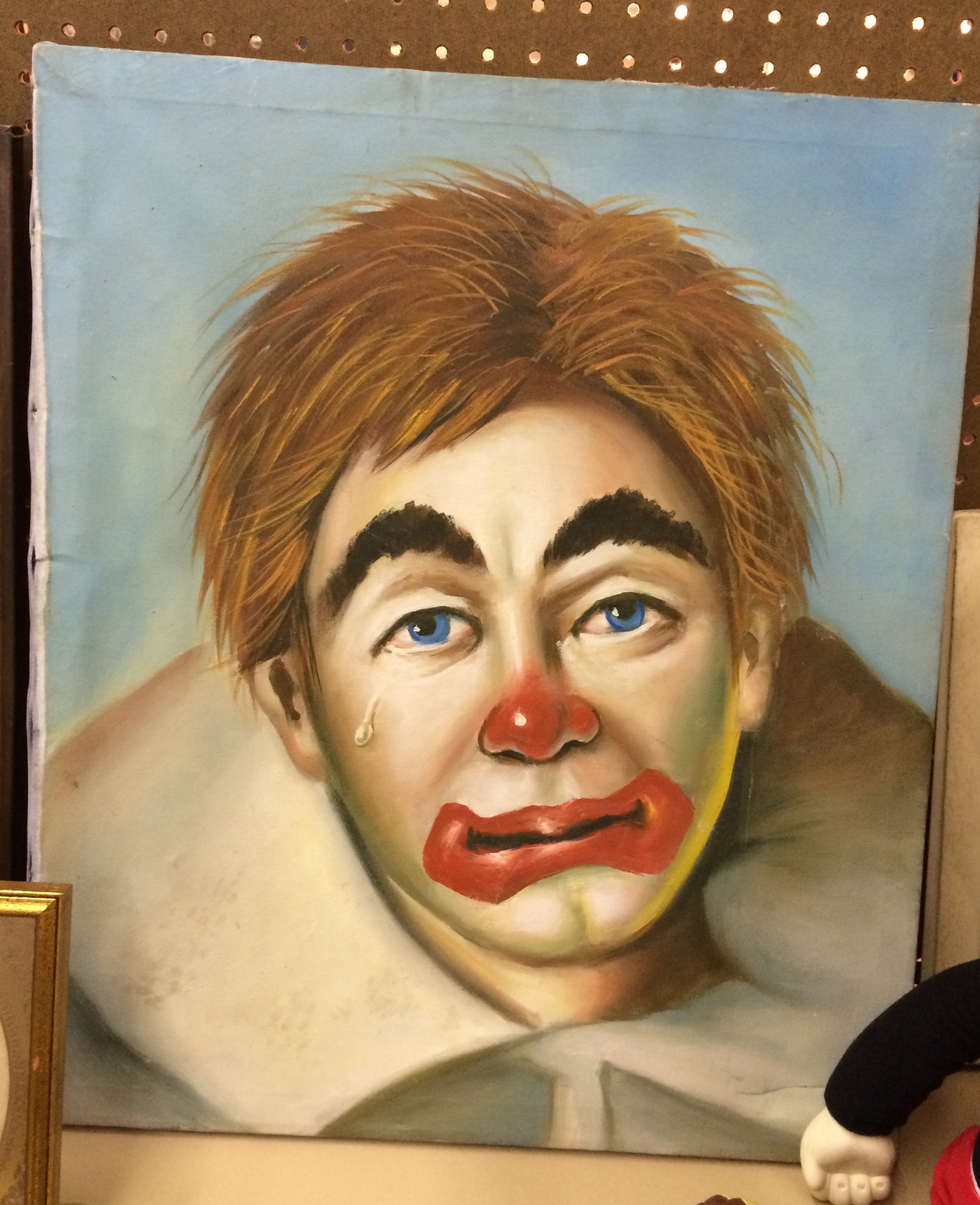 So, to keep your paralyzing curiosity distracted, and therefore not paralyzing, here is a terrifying picture of a clown. A strange man at my favorite antique fair** tried to sell it to my friends and me***. I don’t know why they wouldn’t buy it.